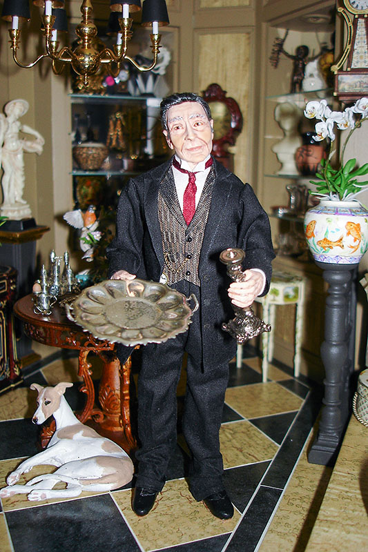 "I purchased Ray Whitledge's Georgian Shop from a friend of mine," Connie Sauve tells us. "She had taken the class from Ray and decided to sell her nearly completed room box. All I had to do to finish it was add the scene in the background, install the chandelier, and paint the outside. I also added the frame to the front of the room box. I used all the fancy, expensive items from my miniature stash to furnish the interior. The only things I purchased specifically for the scene were the round table and painted sideboard. I made both the proprietor and customer figures."